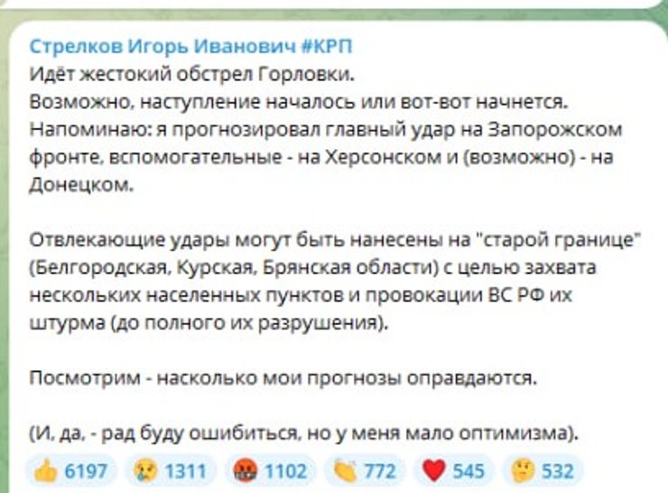 "Идет жестокий обстрел Горловки. Возможно, наступление началось или вот-вот начнется. Напоминаю: я прогнозировал главный удар на Запорожском фронте, вспомогательные – на Херсонском и (возможно) – на Донецком. Посмотрим – насколько мои прогнозы оправдаются. Рад ошибиться, но у меня мало оптимизма", — написал террорист.