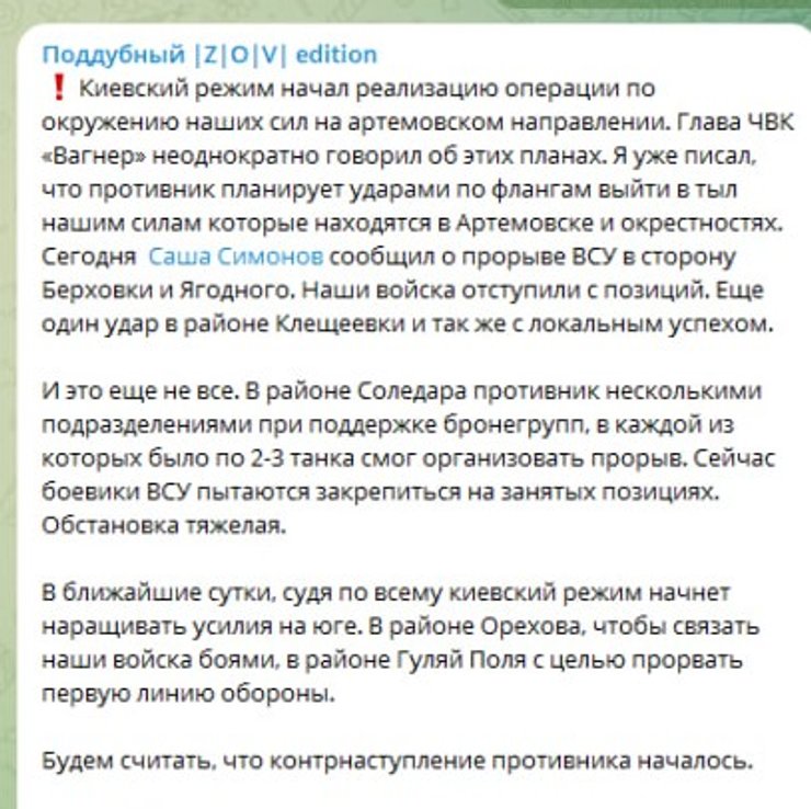 "Наши войска отступили с позиций. Еще один удар в районе Клещиевки и так же с локальным успехом. И это еще не все. В районе Соледара противник несколькими подразделениями при поддержке бронегрупп, в каждой из которых было по 2-3 танка смог организовать прорыв". В настоящее время ВСУ пытаются закрепиться на занятых позициях. Ситуация тяжелая. Будем считать, что контрнаступление противника началось", — написал Поддубный.