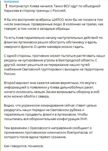 "Контрнаступление Киева началось. Танки ВСУ идут по объездной дороге из Харькова в сторону границы с Россией. В колоннах на тралах, в том числе и западные образцы. О целях маневра можно гадать. С одной стороны, противник может пытаться растягивать наши ресурсы на устранение угрозы в Россию". Белгородской области. С другой, может решиться на перерезание наших путей поставок Сватовской группировки с выходом на территорию России", — написал он.