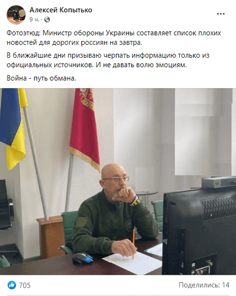 "Фотоэтюд: Министр обороны Украины составляет список плохих новостей для дорогих россиян на завтра. В ближайшие дни призываю черпать информацию только из официальных источников. И не давать волю эмоциям. Война — путь обмана", — написал Копытко.