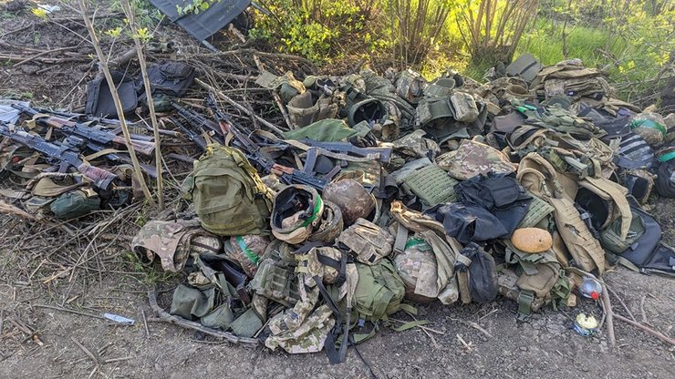 Он обнародовал фотографии с кучей снаряжения, оружия и окровавленной одежды, которую с раненых украинских защитников срезают медики, чтобы осмотреть тело в поисках ран до отправки бойца в стабилизационный пункт.