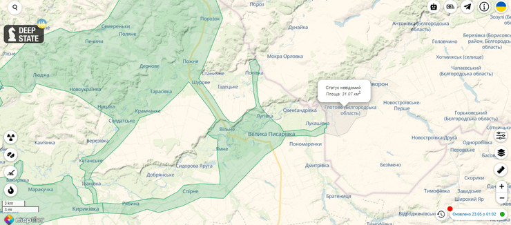 Бои в Белгородской области, по данным сервиса Deep State, охватили уже более 30 квадратных километров. Серая зона на интерактивной карте занимает площадь в 31,07 кв. км.