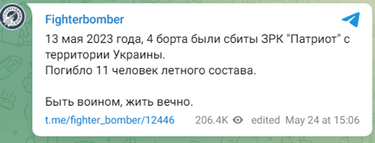 13 мая в небе над Россией зенитный ракетный комплекс Patriot уничтожил 4 российских борта. Об этом 24 мая рассказали российские пилоты, которые ведут Telegram-канал Fighterbomber.