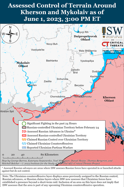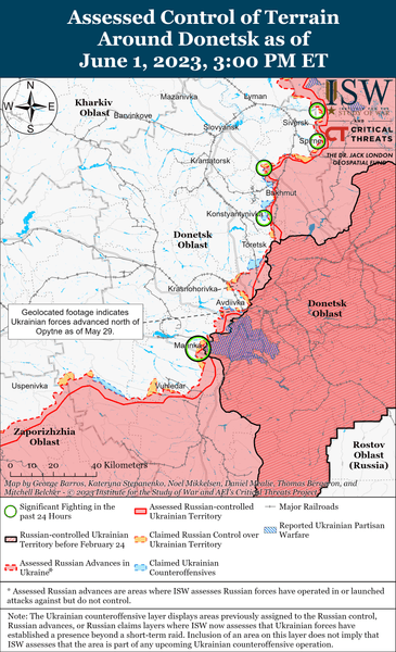 Кроме того, аналитики сообщают, что 1 июня российские войска совершили ограниченные наземные удары вдоль линии Авдеевка-Донецк. В украинском Генштабе сообщили, что российские силы не осуществляли наступательных действий в направлении Авдеевки. Также Силы обороны Украины успешно отразили все атаки в районе Марьинки.