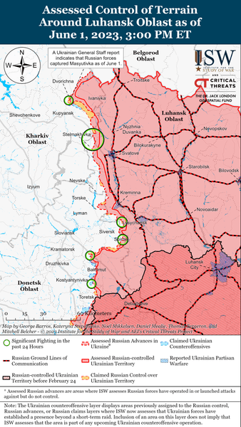 Эксперты полагают, что объявление Генерального штаба Украины об атаках западнее Масютовки, вероятно, указывает на то, что российские силы захватили данный населенный пункт. Российские источники, в свою очередь, утверждали, что оккупанты захватили Масютовку еще 15 мая. Геолокационные данные, опубликованные 31 мая, показывают, что российские войска имели незначительные успехи к юго-востоку от Масютовки.