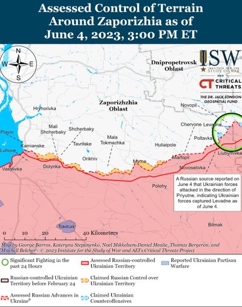 Специалисты ISW проанализировали данные военных блогеров РФ. Они заключили, что украинские войска совершили ограниченные наступления вблизи Малой Токмачки (28 км к юго-востоку от Гуляйполя), и что российские силы нанесли авиаудары по атакующим украинским силам в районе Гуляйполя. Аналитики спрогнозировали, что украинские войска могли прорвать первую линию российской обороны и сумели продвинуться в этом районе на расстояние от 500 метров до 3 километров.
