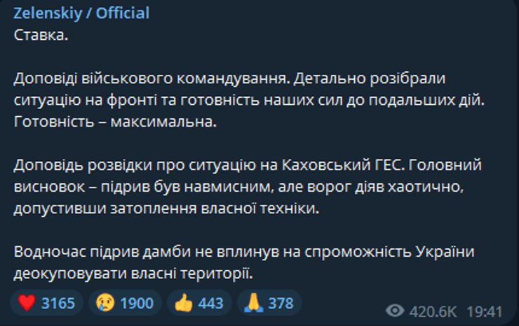 Президент Украины отметил, что подрыв Каховской ГЭС и затопление территорий не повиляет на способность Сил обороны Украины деоккупировать захваченные территории.