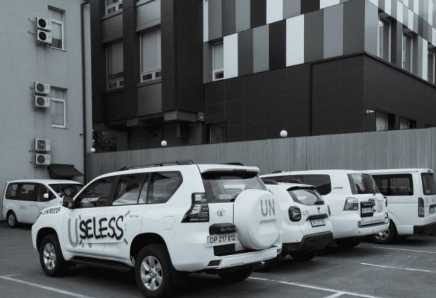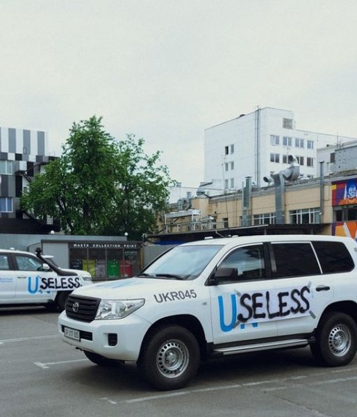 Внимание активистов привлекли находившиеся на стоянке внедорожники ООН и ВОЗ. Затем на транспортных средствах появились надписи Useless.