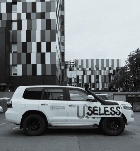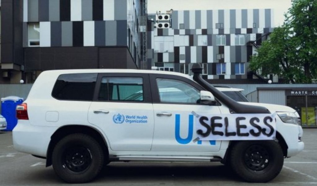 Внимание активистов привлекли находившиеся на стоянке в Киеве внедорожники ООН и ВОЗ. Наклеенные надписи демонстрируют отношение украинцев к международной организации.