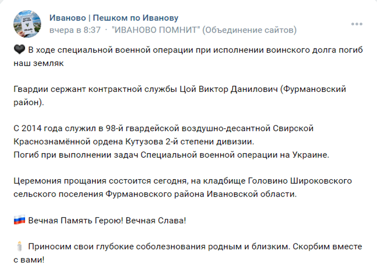 "Погиб при выполнении задач "специальной военной операции" в Украине. Церемония прощания состоится на кладбище Головино Широковского сельского поселения Фурмановского района", — отметили в соцсетях.