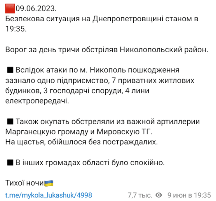 В пятницу, 9 июня, российские оккупанты в очередной раз обстреляли Днепропетровскую область. Под удар попал Никополь и населенные пункты Марганецкой и Мировской громад. Об этом глава Днепропетровского облсовета Николай Лукашук рассказал в своем Telegram-канале.