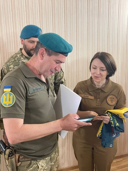 Представитель Минобороны опубликовала совместную фотографию с Сергем Олейником, заместителем командира 35 бригады морской пехоты имени Михаила Острозкого, которая сейчас воюет в восточной части Украины. Оба смотрят на экран смартфона с радостными выражениями на лицах.
