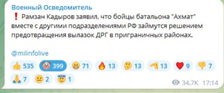 "Рамзан Кадыров заявил, что бойцы батальона "Ахмат" вместе с другими подразделениями РФ займутся решением предотвратить вылазки ДРГ в приграничных районах", — говорится в сообщении.