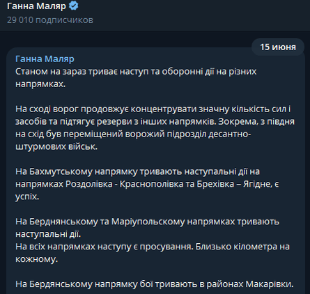 "Наши войска имеют дело с мощным сопротивлением врага и его преимуществом в количестве людей и вооружения. Враг изо всех сил пытается не допустить продвижения наших войск. Вместе с тем, наступление продолжается на нескольких направлениях, наши защитники постепенно, но уверенно продвигаются вперед и наносят значительные потери врагу", — отметила Маляр.