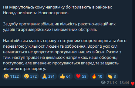 Наступательные действия успешно продолжаются на Бахмутском направлении, в районах Роздоловка — Краснополовка и Бреховка — Ягодное. Бои также продолжаются на Бердянском и Мариупольском направлениях, с небольшим продвижением вперед.
