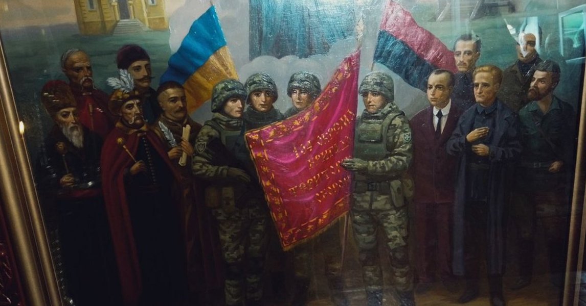 Руководитель ПЦУ Епифаний в Ровенской области освятил образ, написанный военным. На изображении якобы представлены выдающиеся лидеры украинского национального движения Степан Бандера, Роман Шухевич и Евгений Коновалец. Об этом сообщает в Facebook пресс-служба 104 бригады территориальной обороны Ровенщины.