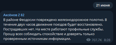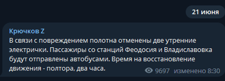 Так называемый "советник главы Крыма" Олег Крючков уточнил, что из-за диверсии на железной дороге пришлось отменить две утренние электрички.