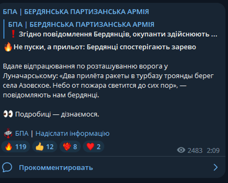 "Удачная отработка по расположению врага у Луначарского: "Два прилета ракеты в турбазу "Роза", берег села Азовское. Небо от пожара светится до сих пор", — сообщают нам бердянцы", — сказано в сообщении Бердянской партизанской армии.
