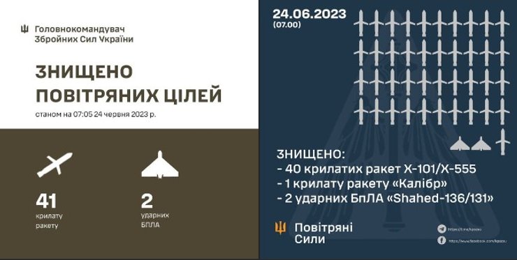 Согласно официальной информации, Генштаба ВСУ силы украинской ПВО 24 июня уничтожили 40 крылатых ракет Х-101 и Х-555, 1 крылатую ракету "Калибр" и 2 беспилотника Shahed-136/131.