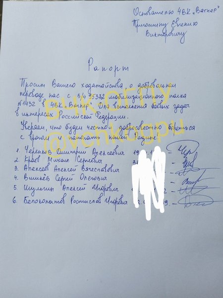 Первый рапорт составили семь военнослужащих из части 73966. А во втором шесть военных просят ходатайство главы ЧВК "Вагнер" Евгения Пригожина о переводе из воинской части 95372.