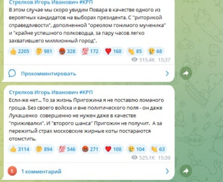 "В этом случае мы скоро увидим Повара как одного из вероятных кандидатов на выборах президента. С "риторикой справедливости", дополненной "ореолом гонимого мученика" и "крайне успешного полководца, который за пару часов легко захватил миллионный город". Если же нет... То за жизнь Пригожина я не поставлю ломаного гроша. Без своего войска и вне политического поля — он даже Лукашенко совсем не нужен даже как "приживалка". И "второго шанса" Пригожин не получит. А за пережитый страх московские жирные коты будут пытаться отомстить", — написал Гиркин.
