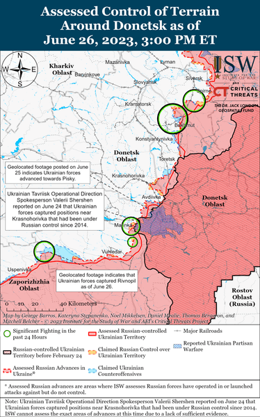 По сообщению аналитиков Института, ВСУ и ВС РФ продолжали боевые действия в районе административной границы Донецкой и Запорожской областей, и украинские силы достигли успехов по состоянию на 26 июня. ВСУ атаковали россиян вдоль линии Левадное-Ривнополь-Макаровка, линии Приютное-Старомерское и вблизи Новодонецкого.