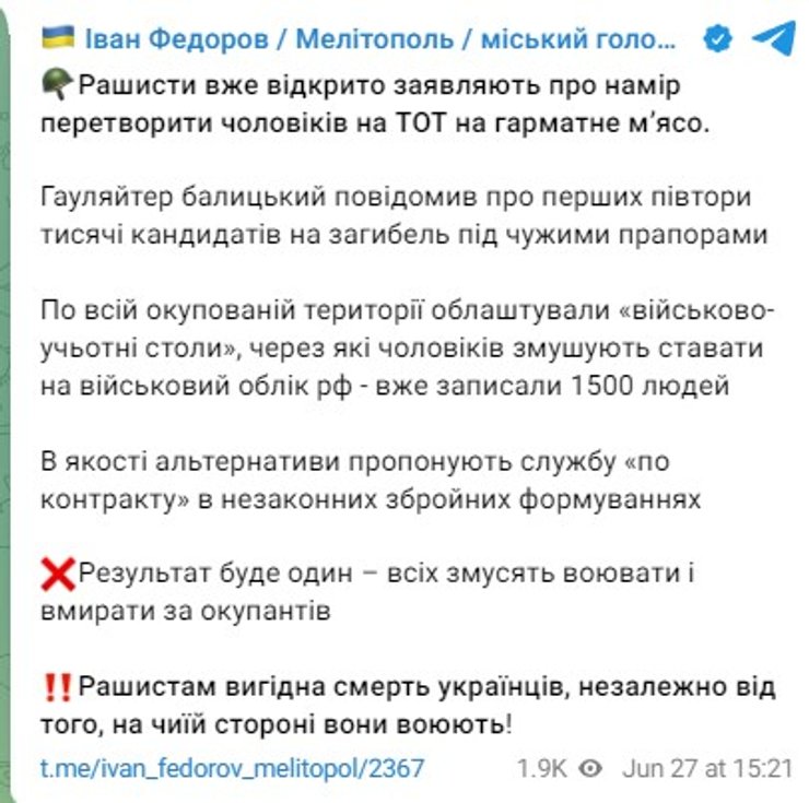 Оккупационные власти Запорожской области создали 44 военно-учетных стола. Мэр Мелитополя Иван Федоров в связи с этим заявил, что россияне хотят превратить мужчин в регионе в "пушечное мясо".