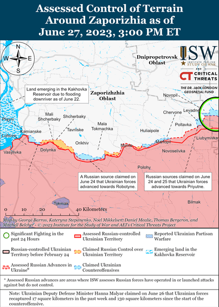 На западном Запорожье украинские войска провели успешные контрнаступательные действия на направлении Новоданиловка-Роботино (Орехов). Тем временем в МО РФ заявили, что ВС РФ остановили украинскую ДРГ вблизи Роботино (12 км к югу от Орехова), а оккупационные власти сообщили, что ВСУ возобновили атаки вблизи Роботино, чтобы восстановить контроль над ранее освобожденными украинскими позициями к северу от населенного пункта, который российские войска отбили 26 июня.