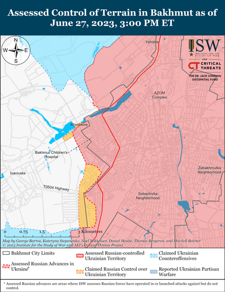 Силы обороны воспользовались мятежом Пригожина в РФ и активизировали контрнаступательные операции в районе Бахмута. Украинская сторона заявила, что ситуация в Бахмуте сложная, поскольку ВС РФ занимают большие укрепления в городе, а украинские войска будут продвигаться медленнее, но ВСУ имеют боевую инициативу на флангах в районе Бахмута и продолжают наступательные действия в районах Орехово-Васильевки (11 км к северо-западу от Бахмута), Ивановского (6 км к западу от Бахмута), Курдюмовки (14 км к юго-западу от Бахмута) и Северного (20 км к юго-западу от Бахмута). Известный российский милблогер заявил, что ситуация для ВС РФ к северу от Соледара "тяжелая", и что украинские силы контратакуют в направлении Яковлевки (14 км к северо-востоку от Бахмута).