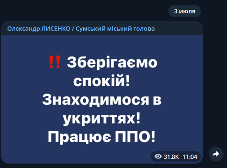 По сообщению Сумского городского головы Александра Лысенко, в городе работают расчеты противовоздушной обороны.