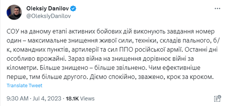 Данилов подчеркнул, что в настоящий момент происходят активные боевые действия, в ходе которых Силы обороны Украины выполняют свою главную задачу — максимальное уничтожение живой силы, техники, складов топлива и боеприпасов, командных пунктов, артиллерии и ПВО российской армии.