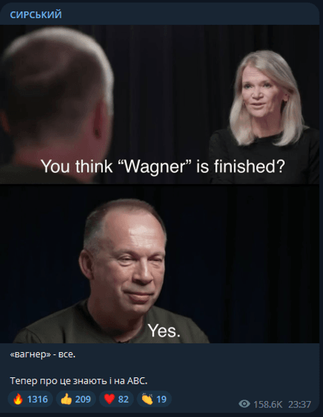 Данное утверждение генерал подтвердил также после интервью. В своем Telegram-канале он опубликовал скриншот интервью и написал: "Вагнер" — все. Теперь об этом знают и на ABC.