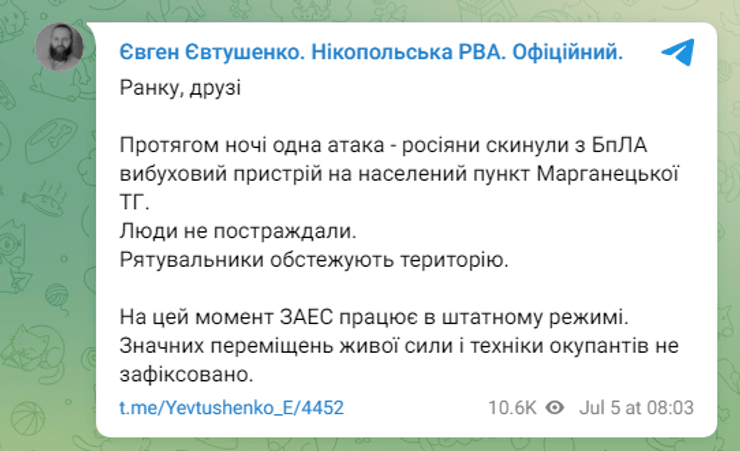 5 июня глава Никопольской районной военной администрации Евгений Евтушенко сообщил, что ночью россияне сбросили с беспилотника взрывное устройство на населенный пункт Марганецкой общины, расположенной на правом берегу Каховского водохранилища — напротив Васильевского района на левом берегу, где находится Энергодар.