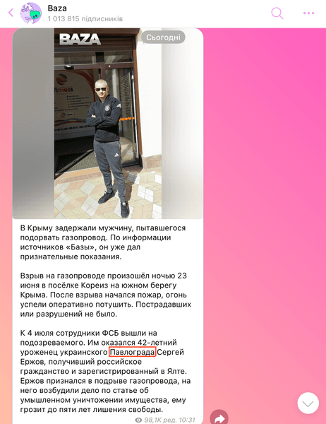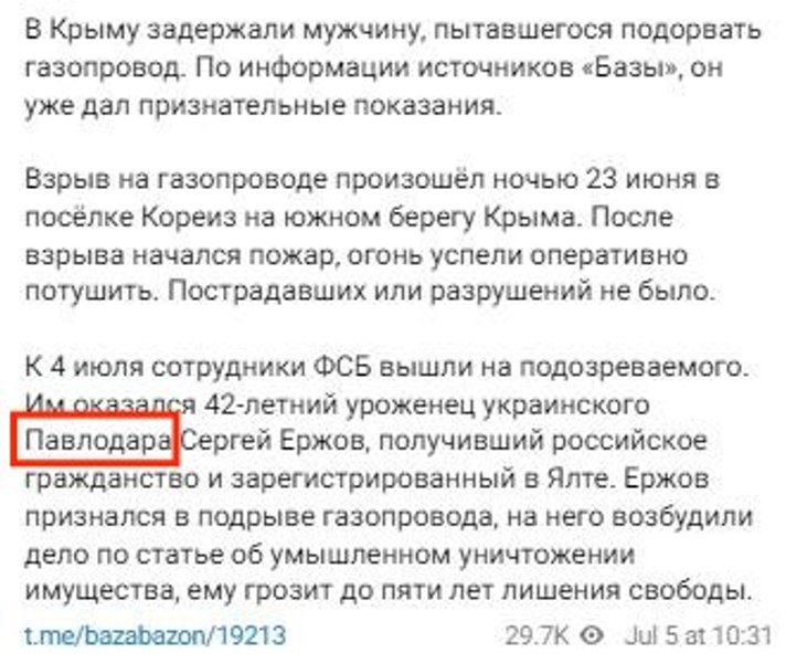 Стоит заметить, что в российском СМИ возникла путаница с местом рождения задержанного. Сначала в посте отмечалось, что Ершов — украинец родом из Павлодара, то есть города в Казахстане. Позже публикация была отредактирована, и мужчина оказался уроженцем Павлограда — города в Днепропетровской области.