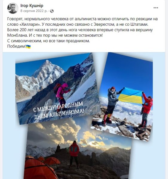 Также там отмечают, что Кушнир является опытным альпинистом, который неоднократно поднимался на самые высокие горы мира.
