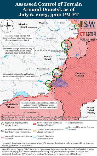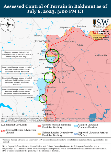 Силы обороны Украины добились существенного успеха на Бахмутском направлении, активно наращивая давление на оккупантов в окрестностях этого города. Также ВСУ продолжают продвижение на Запорожском направлении. На секторе фронта, простирающемся от Сватово до Кременной, силы обороны успешно провели контратаки. Об этом говорится в отчете американского Института изучения войны (ISW), опубликованном 6 июля.