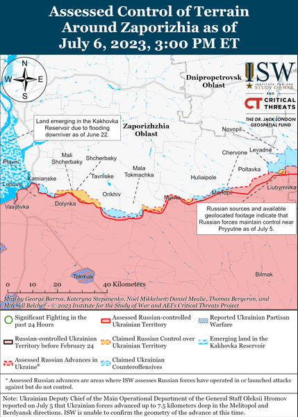 6 июля украинские силы продолжили контрнаступательные операции на западе Запорожской области. Украинский Генеральный штаб сообщил о наступательных операциях на Мелитопольском направлении и закреплении контроля над новыми позициями. Пресс-секретарь российской Восточной группировки войск заявил, что российские подразделения отразили украинскую атаку в районе Пятихаток. Российские блогеры разделились во мнениях относительно характера украинских контрнаступательных операций. Один блоггер утверждает о попытках украинских сил продвинуться в направлении Жеребянки, другие утверждают о неудачных наступлениях в направлении Жеребянки и о наличии украинских сил в Пятихатках. Российские блоггеры также утверждают о контратаках и захвате позиций в районе Работино.