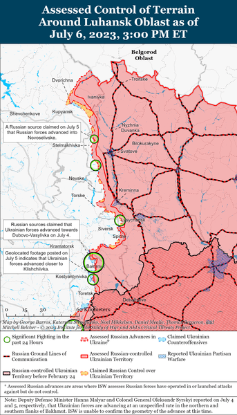 6 июля российские войска продолжили наступательные операции вдоль линии Сватово-Кременная и к югу от Кременной. Украинский Генеральный штаб сообщил, что российские войска пытались продвинуться в районе Новоселовского, Новоегоровки, Кармазиновки и Белогоровки. Российские "военкоры" утверждали, что российские силы продолжали атаки в районе Новоселовского и в Серебрянском лесном массиве к югу от Кременной. Пресс-секретарь Восточной группы войск Украины, полковник Сергей Череватый отметил, что российские силы активно пытаются прорвать украинские оборонительные линии вдоль фронта Купянск-Лиман, используя штурмовые подразделения "Шторм-Z", укомплектованные бывшими заключенными. Череватый также заявил, что в этом районе действуют подразделения БАРС (Российский боевой резерв страны) и неуказанные частные военные компании (ЧВК). Один российский блогер опубликовал кадры, на которых, как сообщается, запечатлен Центральный военный округ (ЦВО) в районе Кременной. Другой блогер утверждает, что бойцы 3-й гвардейской отдельной бригады специального назначения наносят удары по украинским укреплениям в районе Кременной.