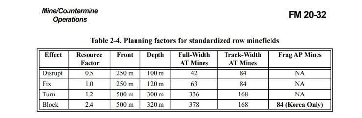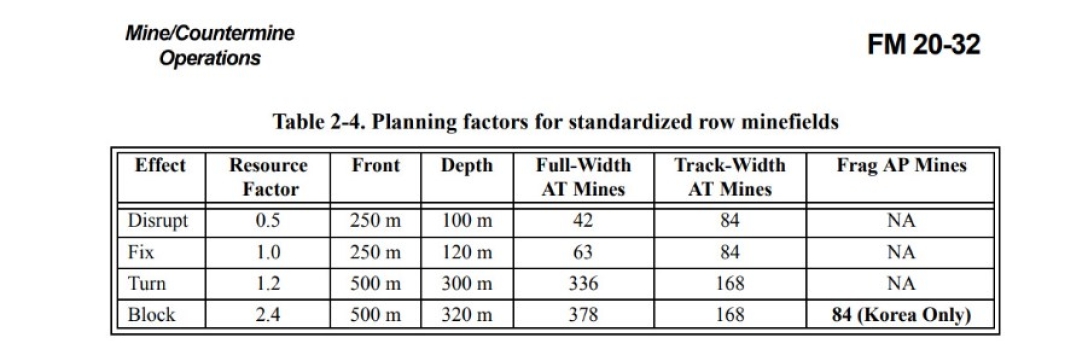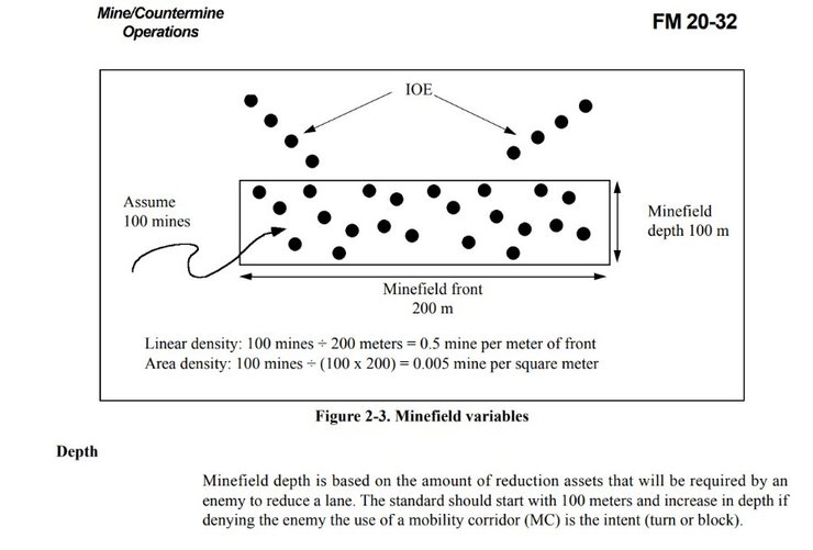 Стоит отметить, что в армии США существует таблица стандартов заминирования. В ней указаны стандартные ширина и глубина минных полей.