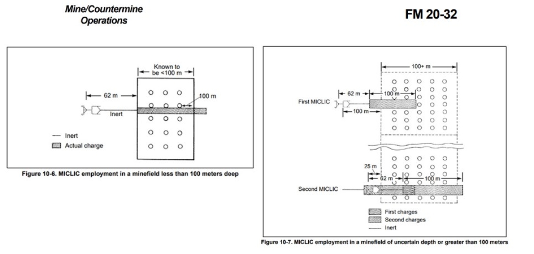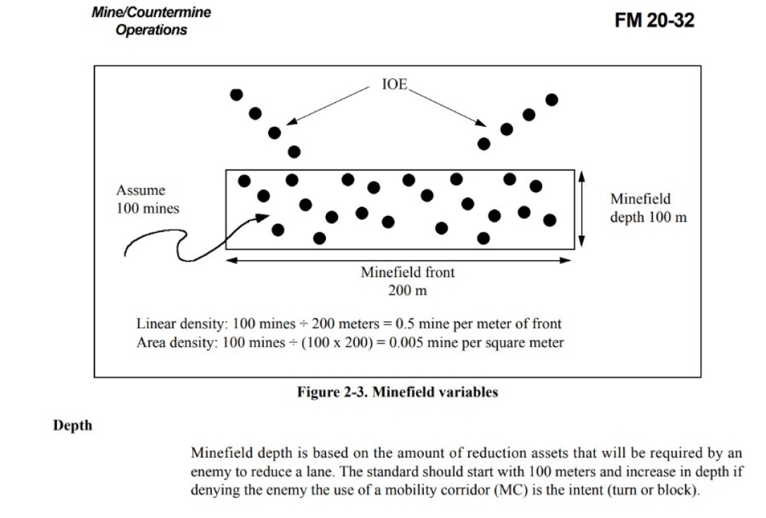 В публичном руководстве по минной угрозе армии США 2004 года минное поле указано, как прямоугольник 100 на 200 метров. Мины, как указано в документе, устанавливаются в 50 см друг от друга по фронту. На один квадратный метр норма составляет 0,005 мины. Это с уточнением, что это минимальный параметр, как по размеру, так и по использованию мин.