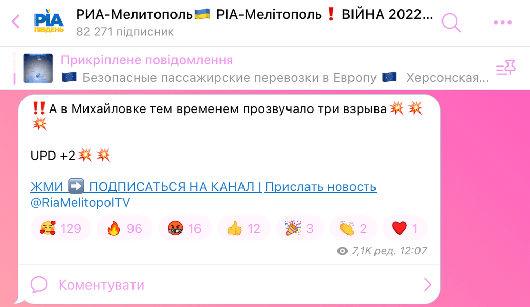 В поселке Михайловка Запорожской области прозвучало по меньшей мере пять взрывов. Также "мощный взрыв" услышали в Мелитополе.