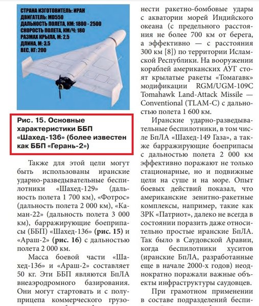 "Также для это цели могут быть использованы иранские ударно-разведывательные беспилотники "Шахед-129"", — говорится в публикации, и далее перечисляются основные летные характеристики дрона.