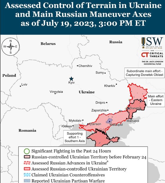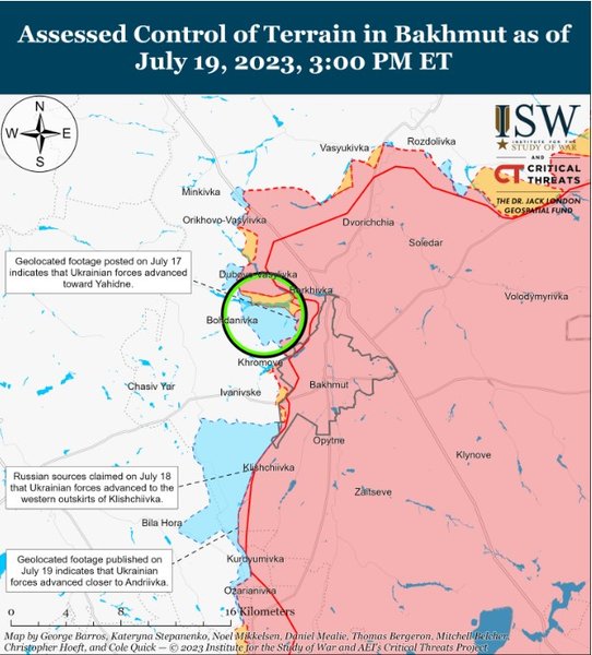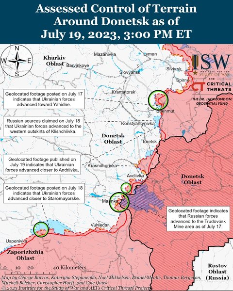 Украинские войска 19 июля провели контрнаступательные операции как минимум на трех участках фронта и добились успехов. Подразделения Сил обороны продвинулись на флангах под Бахмутом, в частности, в районе населенных пунктов Андреевка и Орехово-Васильевка. Об этом со ссылкой на украинские источники сообщили аналитики Института изучения войны (ISW).