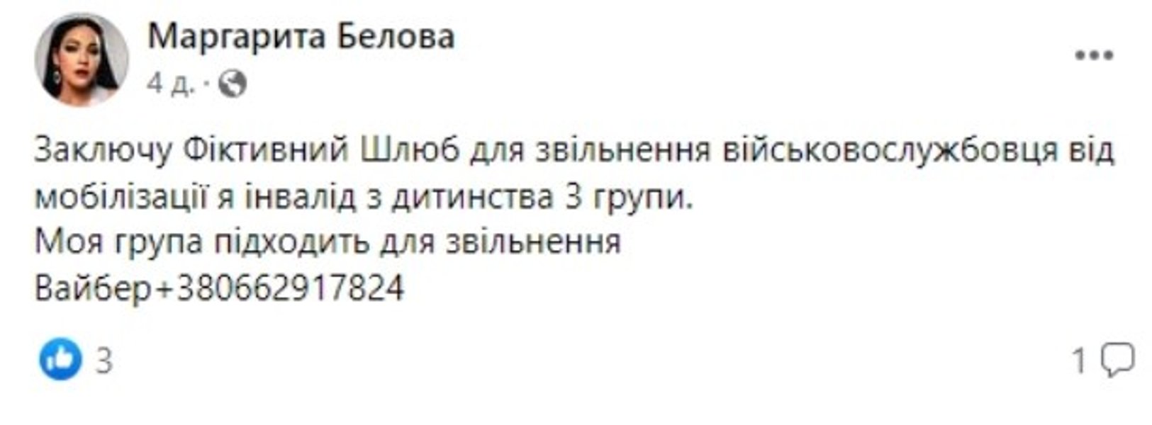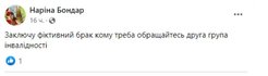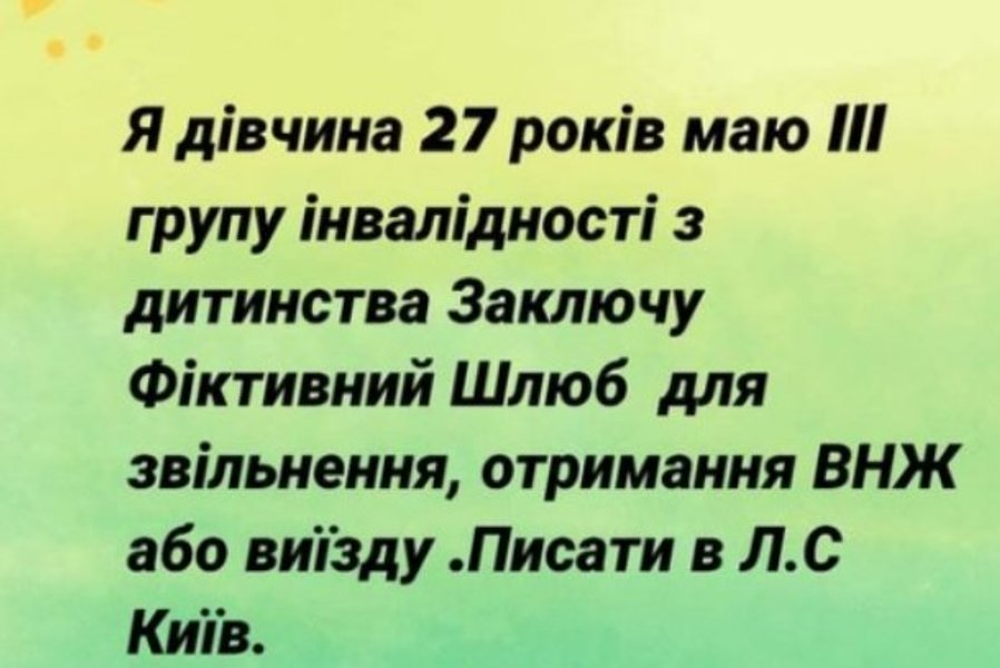 В интернете можно найти группы, где предлагают оформить фиктивный брак с женщиной, которая имеет инвалидность. Для этого нужно оплатить определенную сумму. В основном в объявления предлагают провести соответствующие манипуляции для того, чтобы помочь мужчине "откосить" от мобилизации. Чуть меньше предложений — чтобы выехать за пределы Украины.