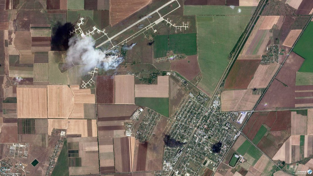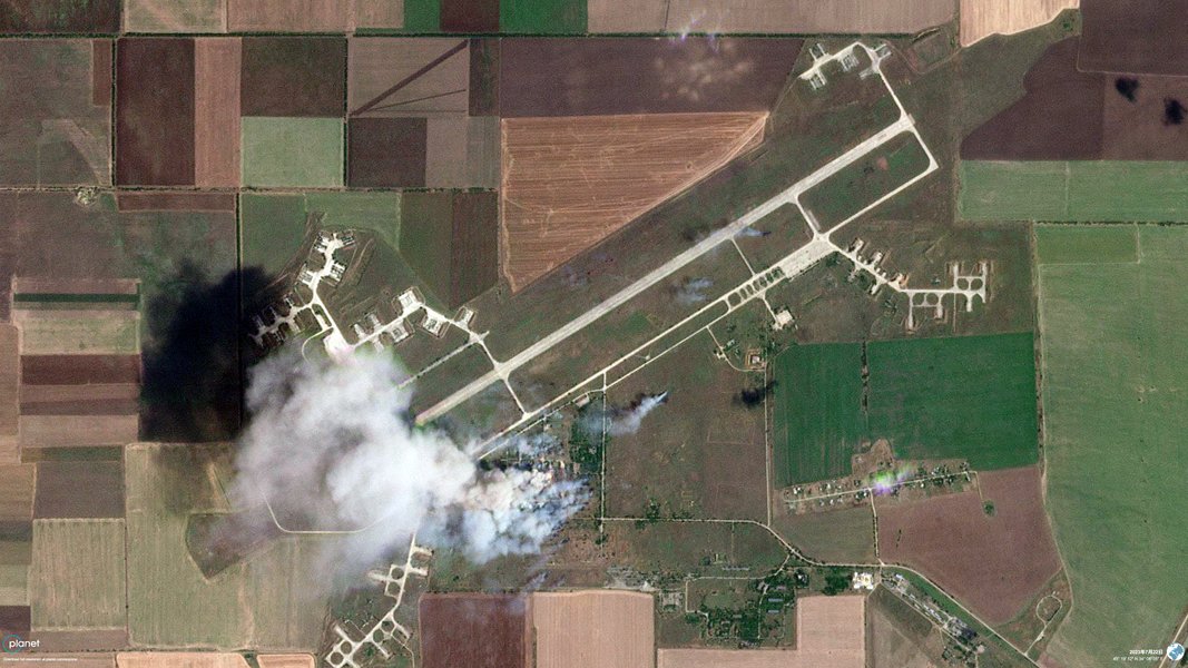 "Аэродром в Октябрьском, контролируемый Россией, в центре Крыма, 22 июля. В результате атаки украинских сил взорвался склад боеприпасов, образовав столб дыма" — подписал снимок Ватанаве.