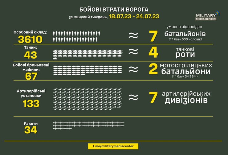 По итогам прошлой недели с 18 по 24 июля потери ВС РФ в Украине составляют: