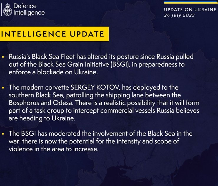 После выхода России из зерновой сделки корабли Черноморского флота РФ изменили свою позицию, подготовившись к блокаде Украины и перехвату коммерческих судов, которые отправятся в украинские порты. Об этом 16 июля сообщила пресс-служба Минобороны Великобритании.