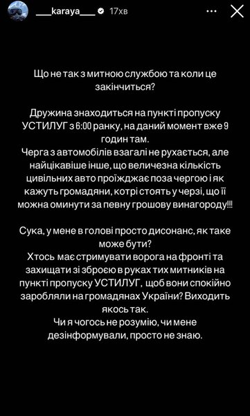 "Что не так с таможенной службой, и когда это кончится? С*ка, у меня в голове просто диссонанс, как такое может быть? Кто-то должен сдерживать врага и защищать с оружием в руках тех таможенников на пункте пропуска "Устилуг", чтобы они спокойно зарабатывали на гражданах Украины? Как-то так получается... Или я чего-то не понимаю, или меня дезинформировали, просто не знаю", — написал KARAYA.