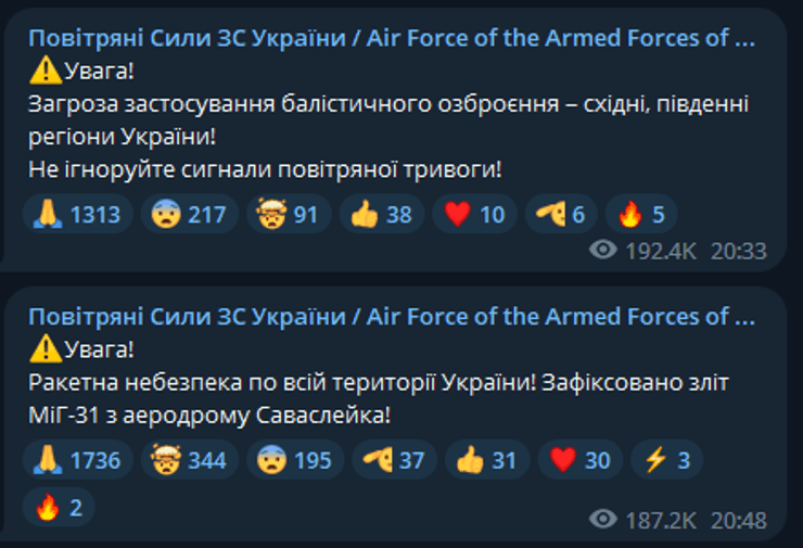 Вместе с тем в Воздушных силах ВСУ сообщали об угрозе применения баллистического вооружения на востоке и юге страны. ТАкже сообщалось о взлете МмГ-31 с аэродрома "Саваслейка".