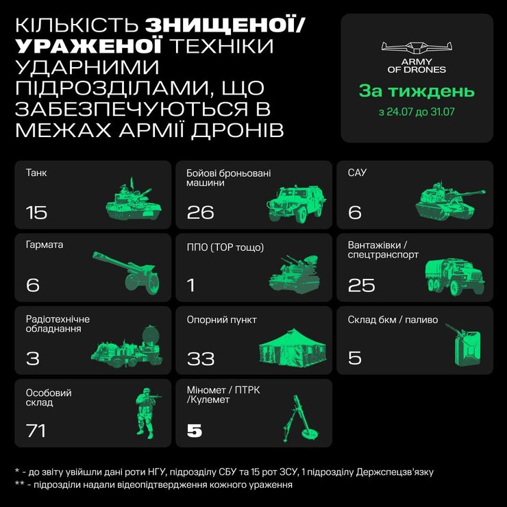 За период с 24 по 31 июля украинские БПЛА ликвидировали 26 боевых бронированных машин, 15 танков и 71 захватчика.